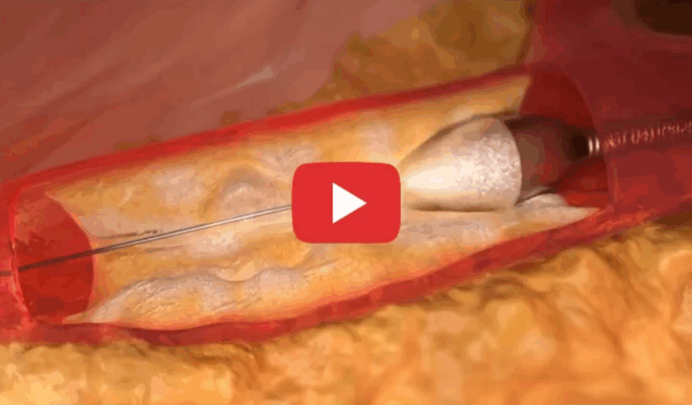 The inflation of the balloon compresses the fatty tissue in the artery and makes a larger opening inside the artery for improved blood flow.